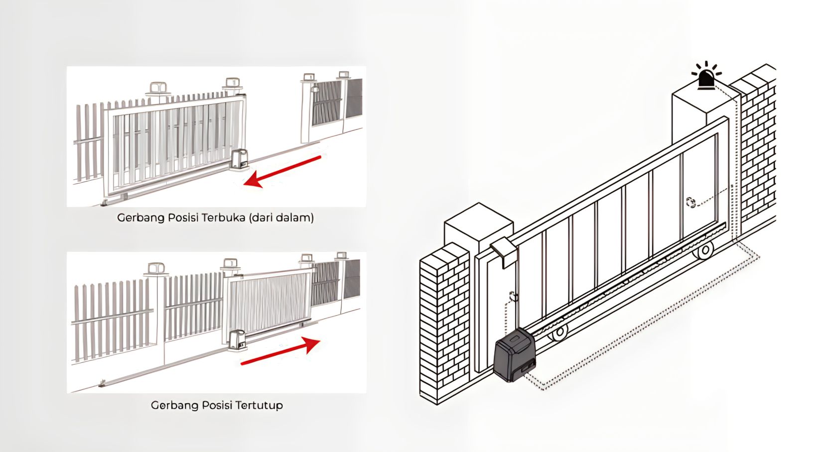 Kamu juga dapat menambahkan komponen opsional berupa alarm lamp sebagai penanda adanya pergerakan pagar, baik pada Automatic Swing atau Automatic Sliding Gate.