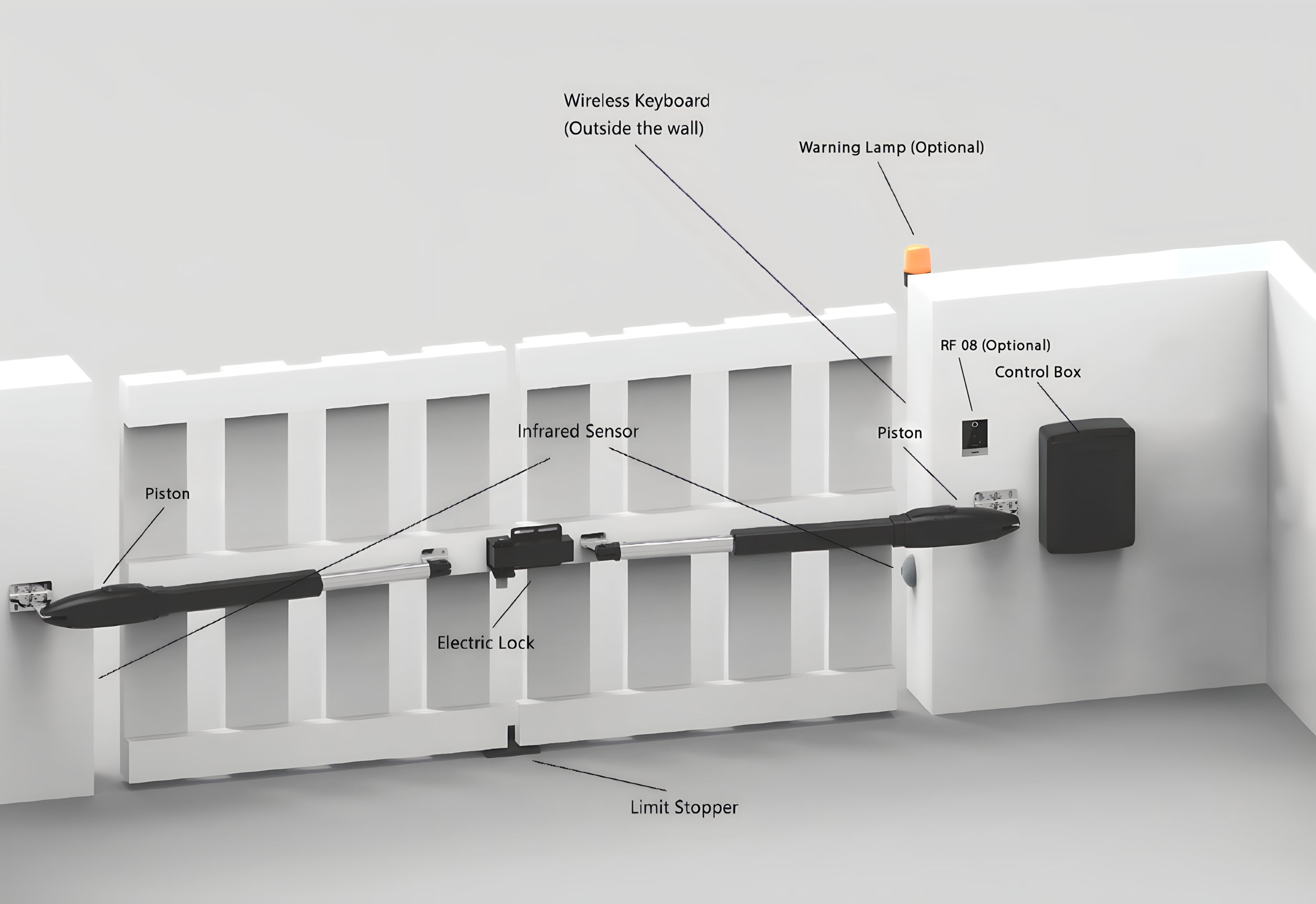 Sistem ini dijalankan dengan energi listrik. Namun Tak perlu khawatir, kamu dapat menggunakan manual key saat tak ada daya listrik. Caranya dengan memasukkan manual key tersebut pada gate opener. Gate opener inilah yang menghasilkan pergerakan pada pagar serta dirancang khusus untuk area outdoor sehingga aman jika terkena hujan. Untuk kecepatan buka tutupnya yakni 18-22 detik/90° dan dapat diatur. Kemudian, langkah maksimum pistonnya 32 cm dengan kekuatan maksimum 2900 newton, dan memakan daya 50 watt. Adapun komponen penunjang lainnya di antaranya control box, connector bracket, wall bracket, front mounting, dan limit stopper.