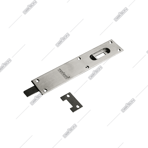 Installed at the top or bottom edge of the door. Slides upwards or downwards to lock the door.